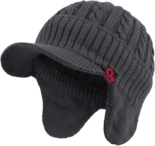 Winter Outdoor Sports Visor Beanie with Earflaps Knit Ski Hat with Brim Fleece Lined Skull Cap